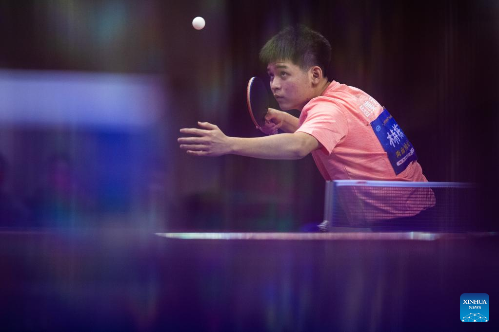 Lin Shidong of Hainan serves during the men's team match against Wang Kaibo of Tianjin at the 2022 Chinese National Table Tennis Championships in Huangshi, central China's Hubei Province, Nov. 3, 2022. (Xinhua/Xiao Yijiu)