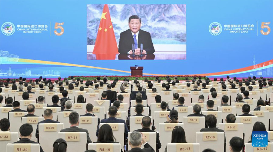 Chinese President Xi Jinping delivers a speech via video at the opening ceremony of the fifth China International Import Expo held in east China's Shanghai on Nov. 4, 2022. (Xinhua/Li Xueren)