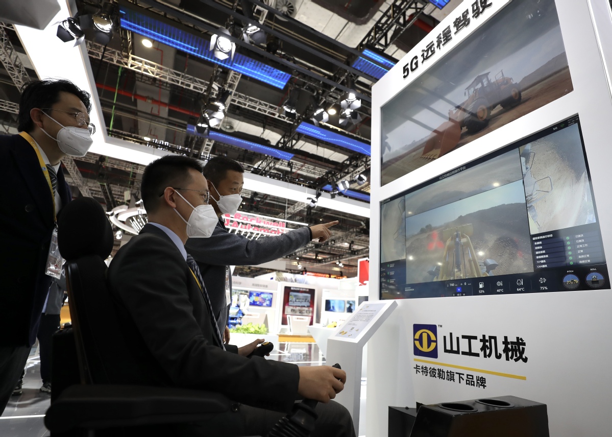 Staff members demonstrate 5G remote driving at the Shandong Engineering Machinery booth at the venue for the 5th CIIE in Shanghai, Nov 4, 2022. [Photo by Zhang Wei/China Daily]