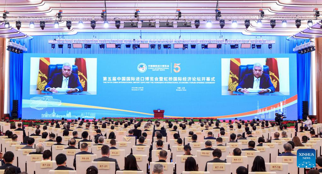 Sri Lankan President Ranil Wickremesinghe speaks via video at the opening ceremony of the fifth China International Import Expo held at the National Exhibition and Convention Center (Shanghai) in east China's Shanghai on Nov. 4, 2022. (Xinhua/Li Jing)