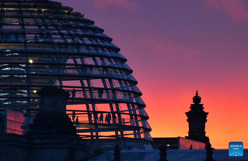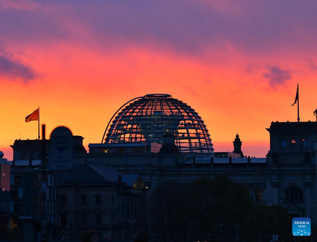 Photo taken on Nov. 4, 2022 shows the German Bundestag in the glow of the sunset in Berlin, capital of Germany. (Xinhua/Ren Pengfei)