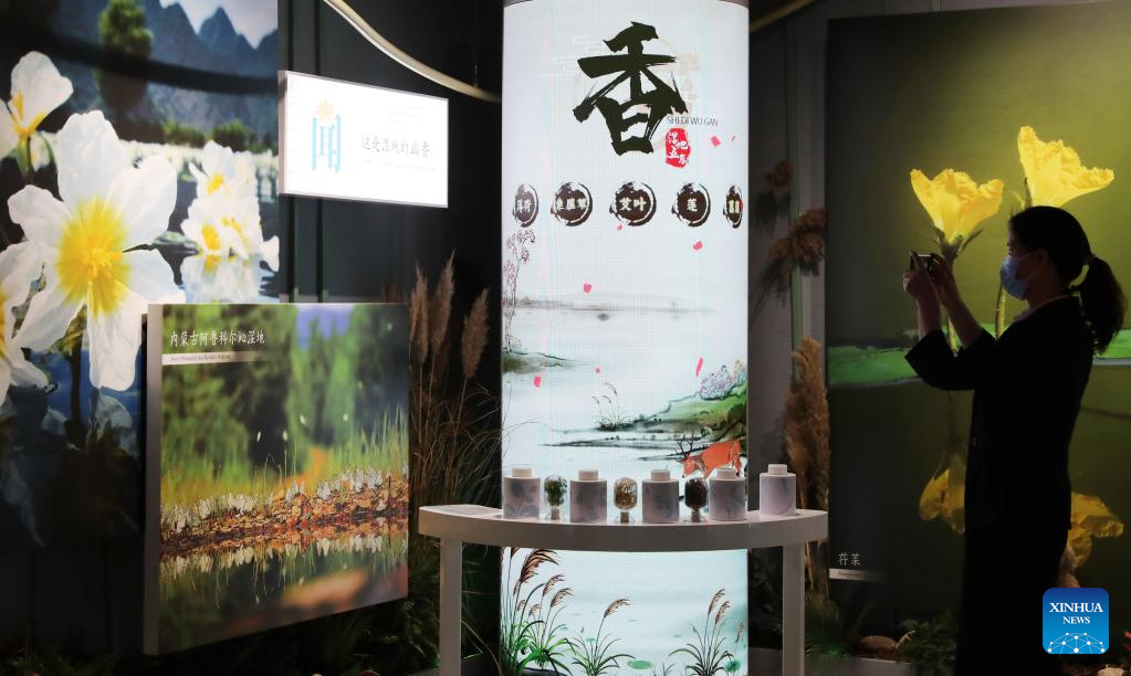 A visitor takes photos at China's Achievement Exhibition for the 30th Anniversary of Accession to the Ramsar Convention on Wetlands, in Wuhan, central China's Hubei Province, Nov. 6, 2022. The achievement exhibition kicked off here on Sunday. (Xinhua/Yao Qilin)