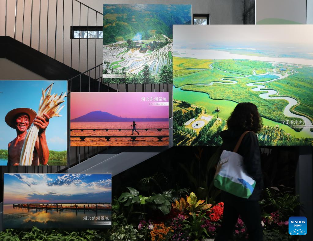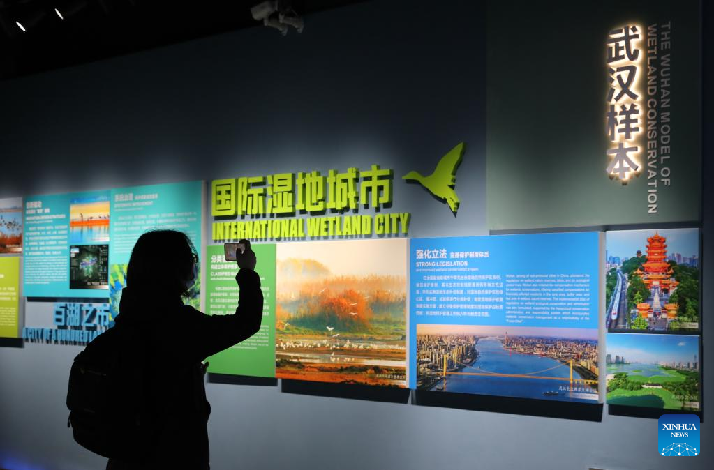 A visitor views pictures at China's Achievement Exhibition for the 30th Anniversary of Accession to the Ramsar Convention on Wetlands, in Wuhan, central China's Hubei Province, Nov. 6, 2022. The achievement exhibition kicked off here on Sunday. (Xinhua/Yao Qilin)