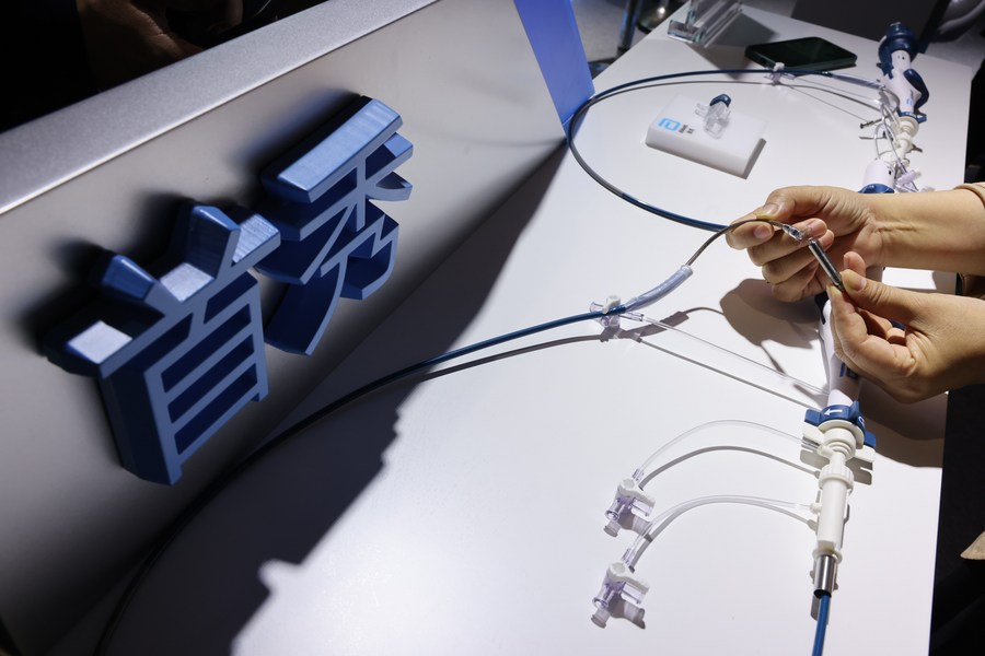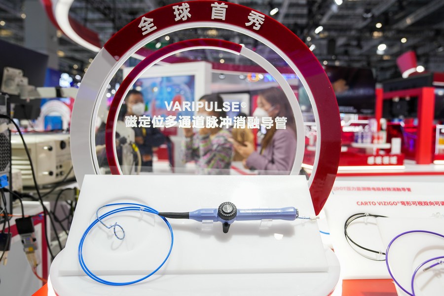 An ablation catheter is displayed at the medical equipment and health care products exhibition area of the fifth China International Import Expo (CIIE) at the National Exhibition and Convention Center (Shanghai) in east China's Shanghai, Nov. 5, 2022. (Xinhua/Ding Ting)