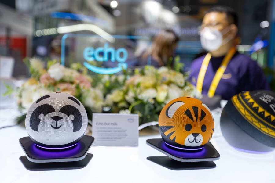 Smart speakers from Amazon are displayed at the fifth China International Import Expo (CIIE) at the National Exhibition and Convention Center (Shanghai) in east China's Shanghai, Nov. 5, 2022. (Xinhua/Wang Xiang)