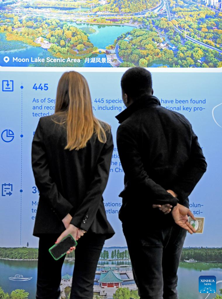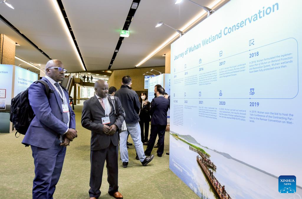 Participants view the exhibition on China's progress in wetland protection and restoration at the 14th Meeting of the Conference of the Contracting Parties to the Ramsar Convention on Wetlands (COP14) in Geneva, Switzerland, Nov. 5, 2022. Themed "Wetlands Action for People and Nature," the COP14 is scheduled to run from Nov. 5 to 13 in China's Wuhan and Switzerland's Geneva. (Xinhua/Lian Yi)