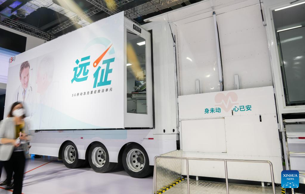 This photo taken on Nov. 6, 2022 shows the "Expedition" 5G mobile emergency and critical interventional treatment unit exhibited at the Siemens Healthineers booth in the medical equipment and healthcare products exhibition area of the fifth China International Import Expo (CIIE) at the National Exhibition and Convention Center (Shanghai) in east China's Shanghai. (Xinhua/Ding Ting)
