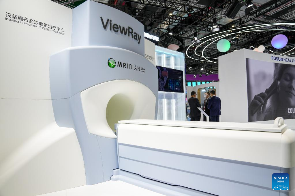 This photo taken on Nov. 6, 2022 shows the MRIdian Linac magnetic resonance guided radiation therapy system exhibited at the Fosun Health booth in the medical equipment and healthcare products exhibition area of the fifth China International Import Expo (CIIE) at the National Exhibition and Convention Center (Shanghai) in east China's Shanghai. (Xinhua/Ding Ting)