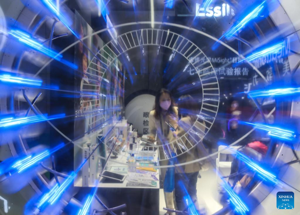 People visit the booth of EssilorLuxottica at the medical equipment and healthcare products exhibition area of the fifth China International Import Expo (CIIE) at the National Exhibition and Convention Center (Shanghai) in east China's Shanghai, Nov. 6, 2022. (Xinhua/Zhang Keren)