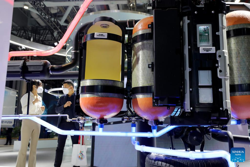 This photo taken on Nov. 6, 2022 shows a hydrogen fuel-cell generator at the booth of South Korea's automaker Hyundai at the automobile exhibition area of the fifth China International Import Expo (CIIE) at the National Exhibition and Convention Center (Shanghai) in east China's Shanghai.