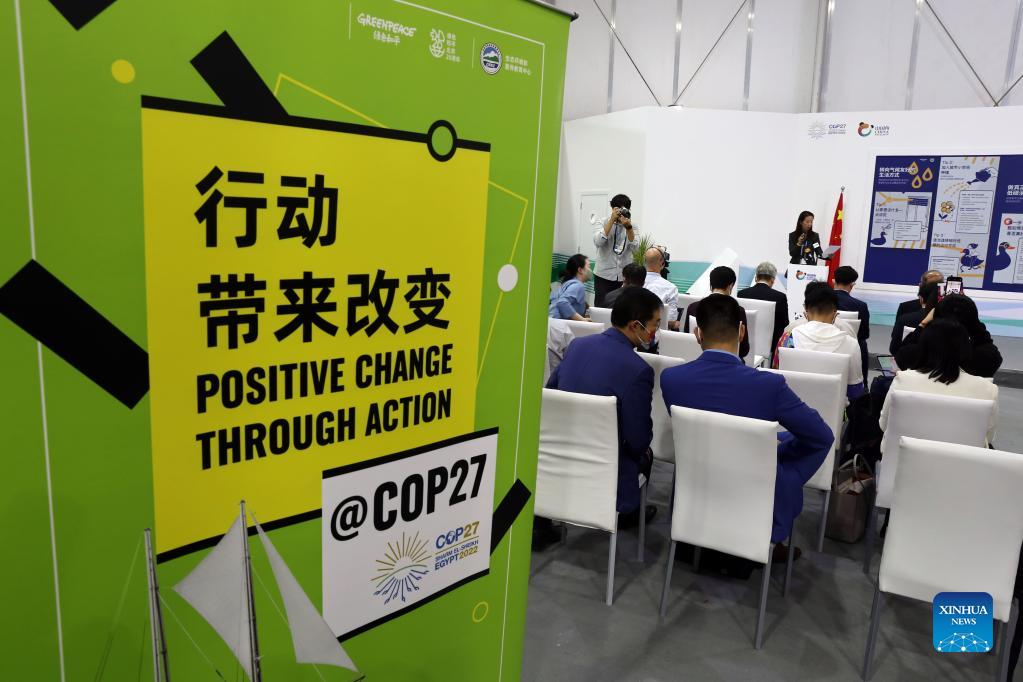 People attend a side event themed "Green Life, Joint Efforts and Shared Benefits -- Advocating Public Participation in Taking Green Actions" in China's pavilion at the venue of the 27th session of the Conference of the Parties (COP27) to the UN Framework Convention on Climate Change, in Sharm El-Sheikh, Egypt, Nov. 6, 2022. China has made remarkable progress toward its goals of reaching peak carbon emissions and carbon neutralization, China's Special Envoy for Climate Change Xie Zhenhua said Sunday at the side event. (Xinhua/Ahmed Gomaa)