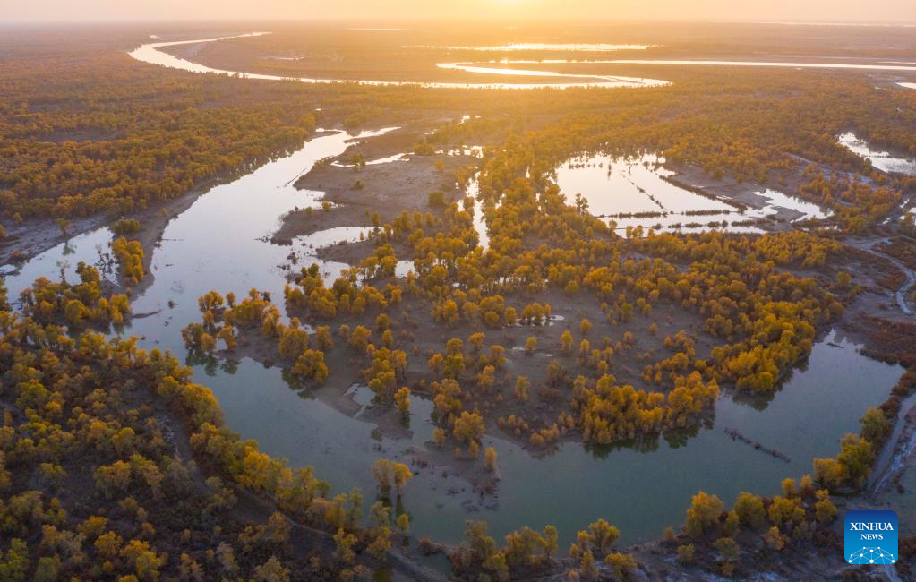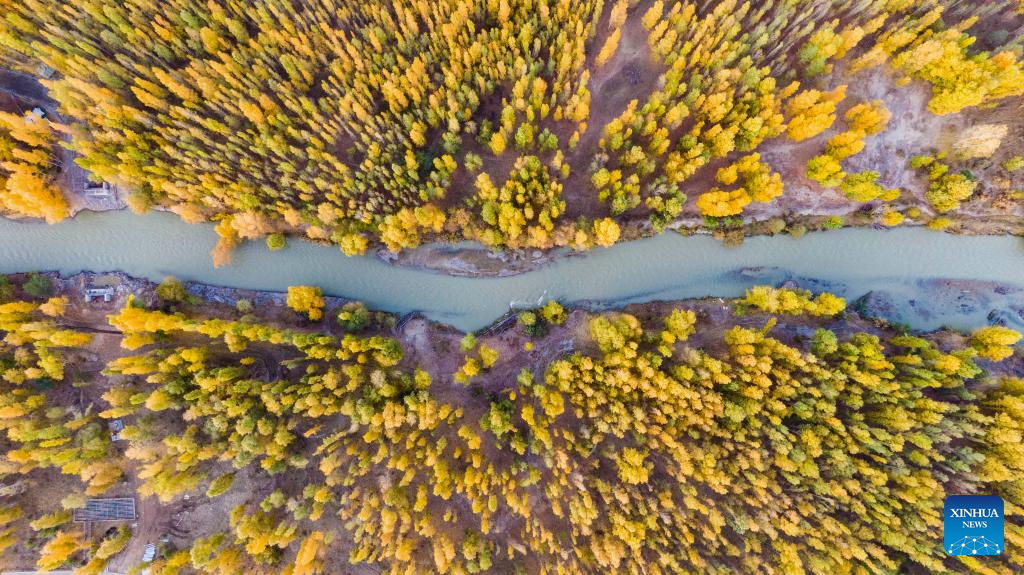 This aerial photo taken on Oct. 20, 2022 shows autumn scenery of the Bortala River National Wetland Park in Bole City, northwest China's Xinjiang Uygur Autonomous Region.