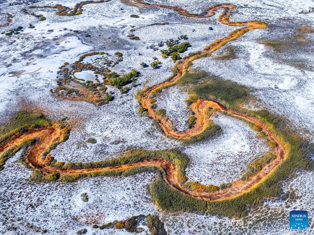 This aerial photo taken on Oct. 5, 2022 shows autumn scenery of the Ebinur Lake Wetland National Nature Reserve in northwest China's Xinjiang Uygur Autonomous Region.