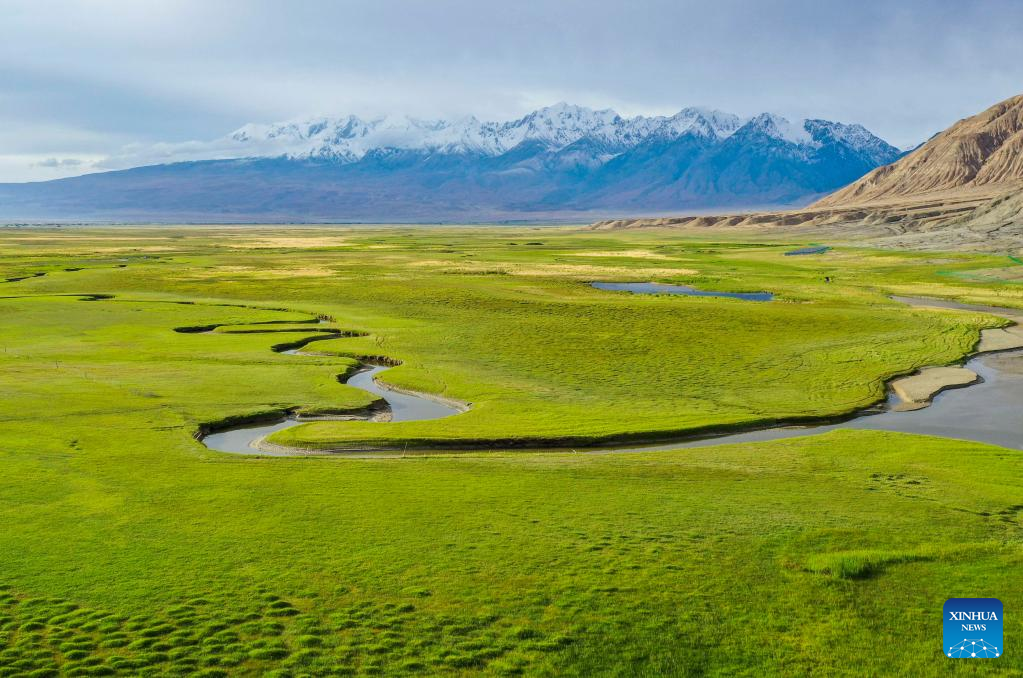 This aerial photo taken on June 30, 2019 shows summer scenery of the Tagarma wetland in Taxkorgan Tajik Autonomous County, northwest China's Xinjiang Uygur Autonomous Region.