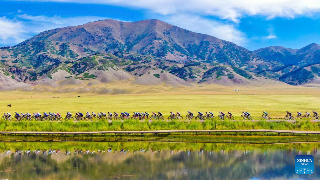 This photo taken on July 26, 2022 shows athletes cycling in the Sayram Lake National Wetland Park in northwest China's Xinjiang Uygur Autonomous Region.