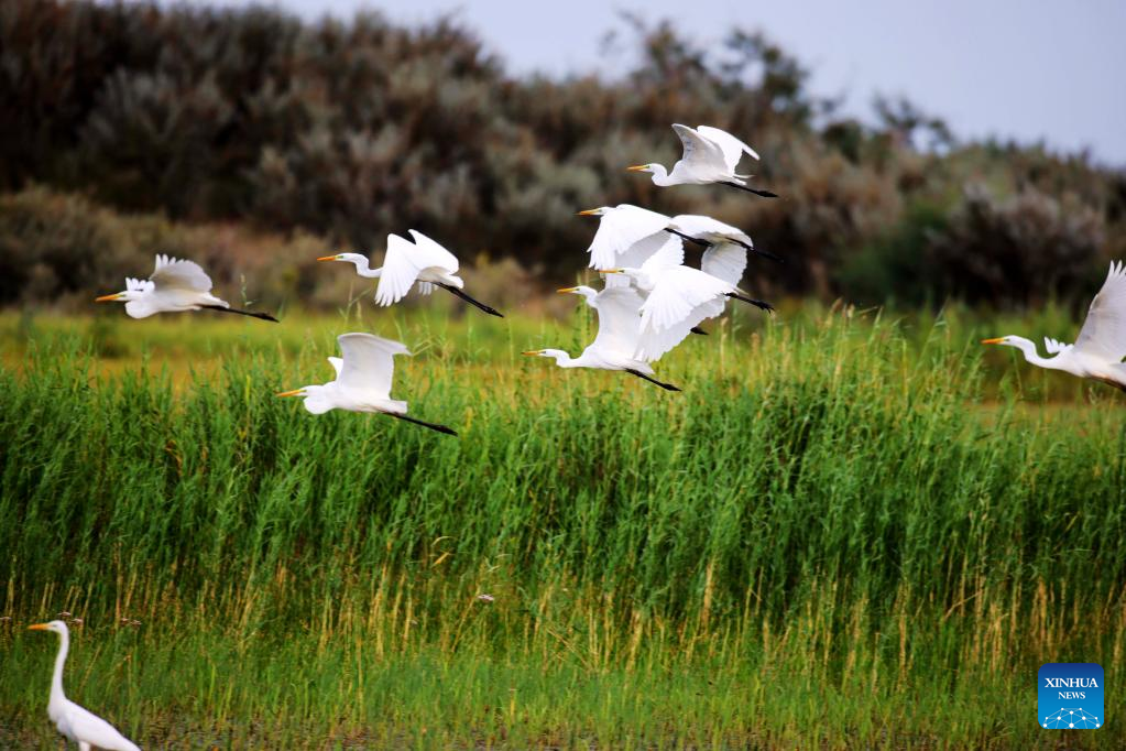 This photo taken on Aug. 8, 2022 shows egrets in the Koksu Wetland Nature Reserve in Altay, northwest China's Xinjiang Uygur Autonomous Region.