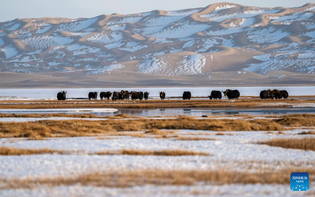 This photo taken on April 2, 2019 shows wild yaks foraging in a wetland in the Altun Mountains National Nature Reserve in northwest China's Xinjiang Uygur Autonomous Region.