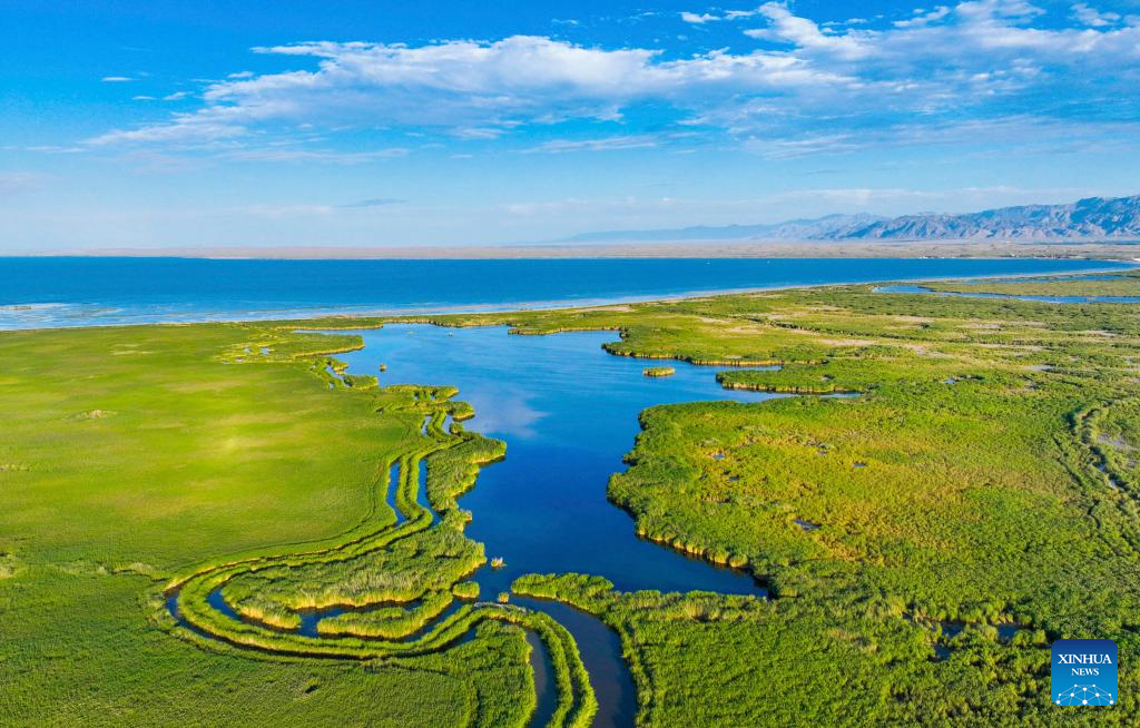 This aerial photo taken on Aug. 27, 2022 shows summer scenery of the Bostan Lake National Wetland Park in northwest China's Xinjiang Uygur Autonomous Region.
