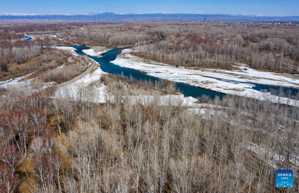 This aerial photo taken on April 8, 2021 shows birch woods on the riverine wetlands formed by the Haba River and its tributaries in northwest China's Xinjiang Uygur Autonomous Region.