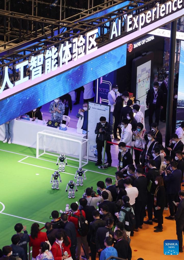 Visitors watch robots performing at the Artificial Intelligence Special Exhibition Zone of the fifth China International Import Expo (CIIE) at the National Exhibition and Convention Center (Shanghai) in east China's Shanghai, Nov. 5, 2022. The fifth CIIE is scheduled on Nov. 5-10 in China's economic hub Shanghai. (Xinhua/Jin Liwang)