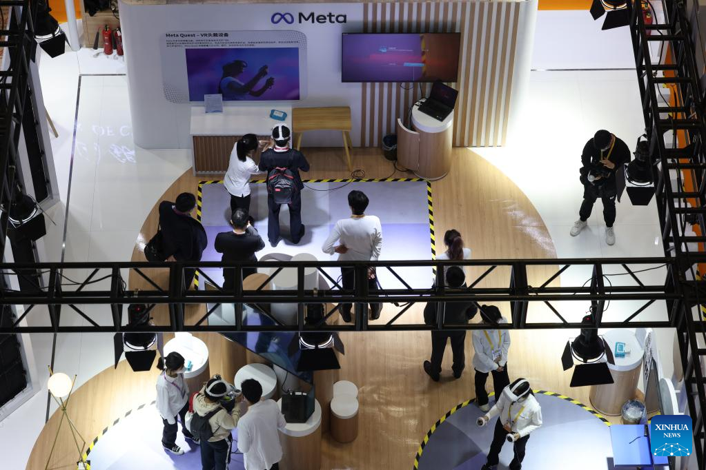 Visitors experience applications of Meta Platforms at the Artificial Intelligence Special Exhibition Zone of the fifth China International Import Expo (CIIE) at the National Exhibition and Convention Center (Shanghai) in east China's Shanghai, Nov. 5, 2022. The fifth CIIE is scheduled on Nov. 5-10 in China's economic hub Shanghai. (Xinhua/Jin Liwang)