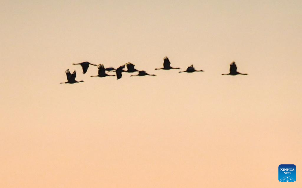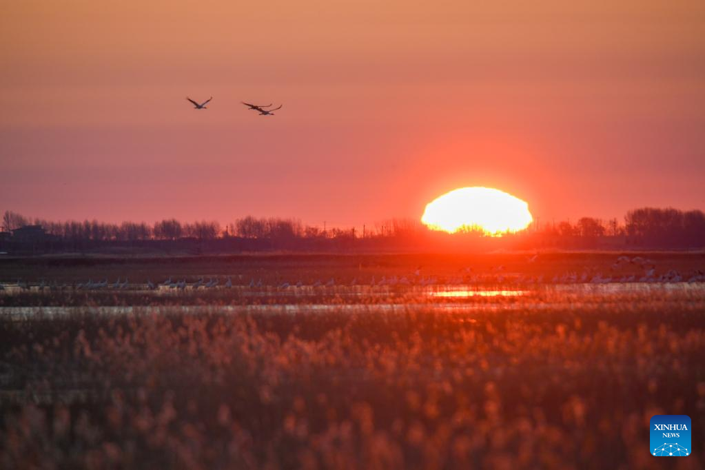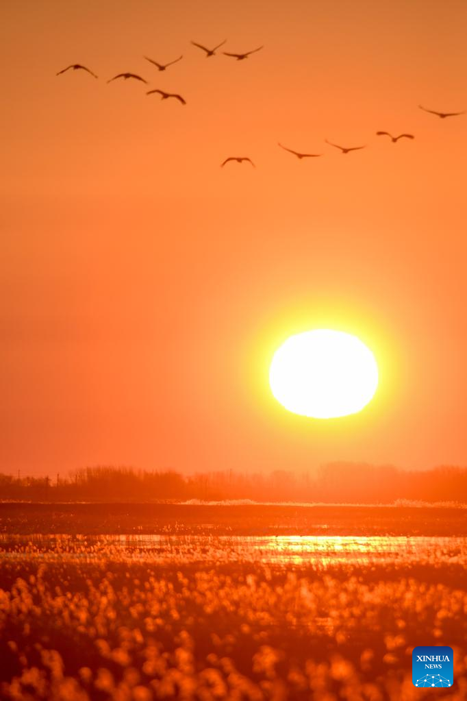 Migrant birds fly over the Momoge National Nature Reserve in Zhenlai County, Baicheng City of northeast China's Jilin Province, Nov. 4, 2022. (Xinhua/Zhang Nan)