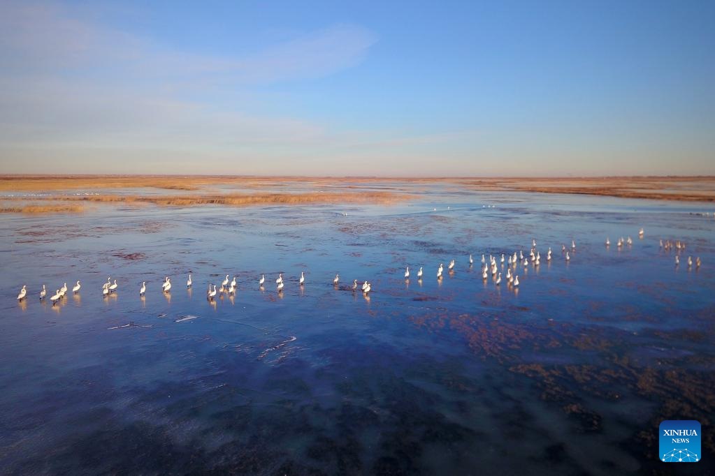 This aerial photo taken on Nov. 4, 2022 shows migrant birds in the Momoge National Nature Reserve in Zhenlai County, Baicheng City of northeast China's Jilin Province. (Xinhua/Zhang Nan)