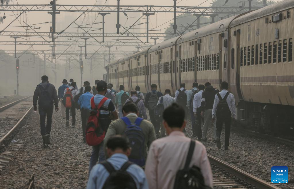 People walk on a railway track amid thick smog in New Delhi, India, Nov. 5, 2022. (Xinhua/Javed Dar)