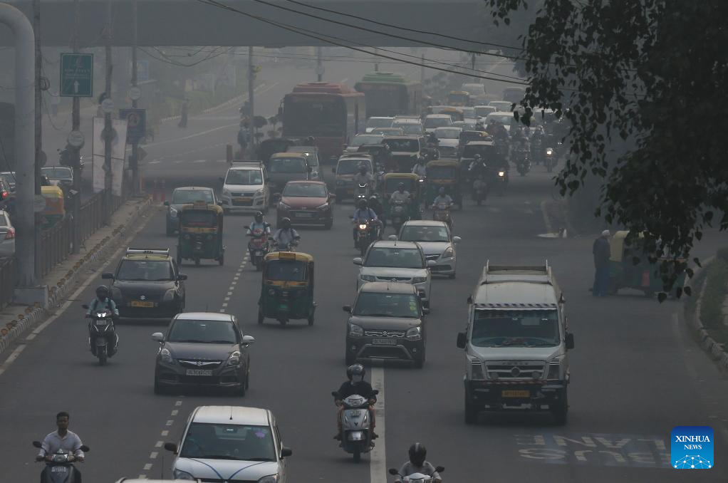 Vehicles and motorcycles move on a road amid thick smog in New Delhi, India, Nov. 5, 2022. (Xinhua/Javed Dar)
