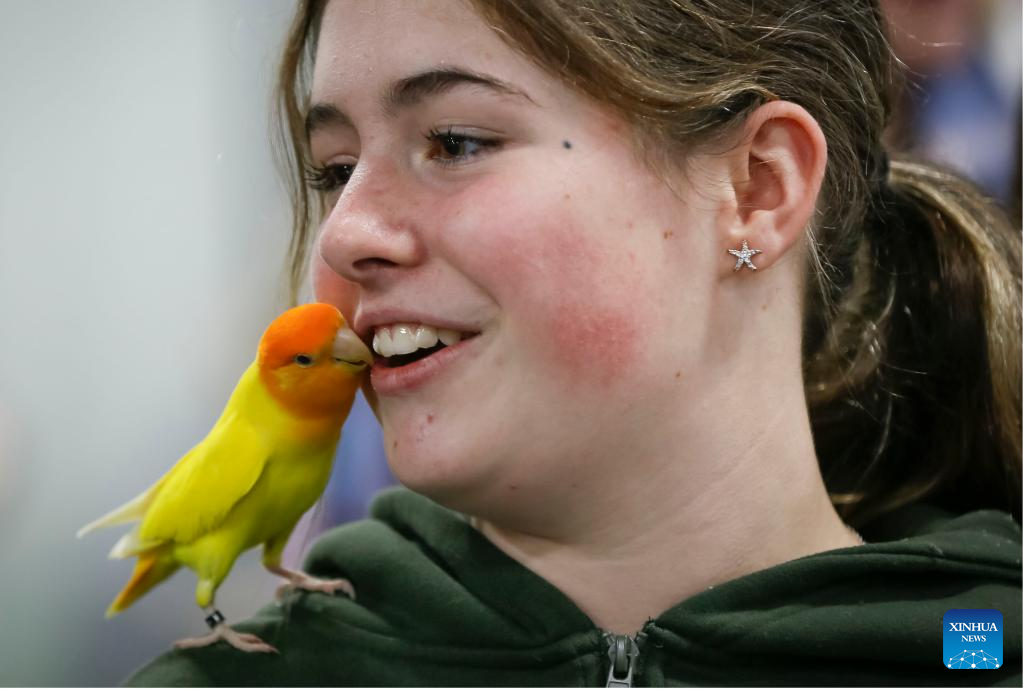 A girl interacts with a bird during the Pet Lover Show at Pacific Coliseum in Vancouver, British Columbia, Canada, on Nov. 6, 2022. (Photo by Liang Sen/Xinhua)