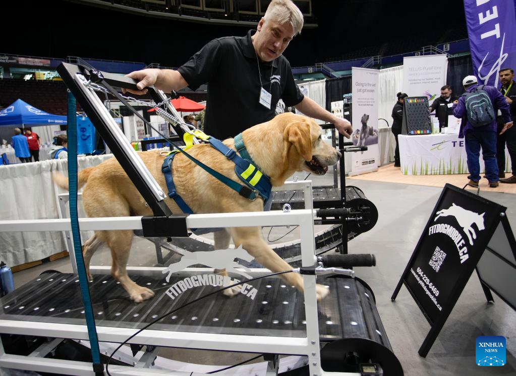 A dog tries out a running machine during the Pet Lover Show at Pacific Coliseum in Vancouver, British Columbia, Canada, on Nov. 6, 2022. (Photo by Liang Sen/Xinhua)