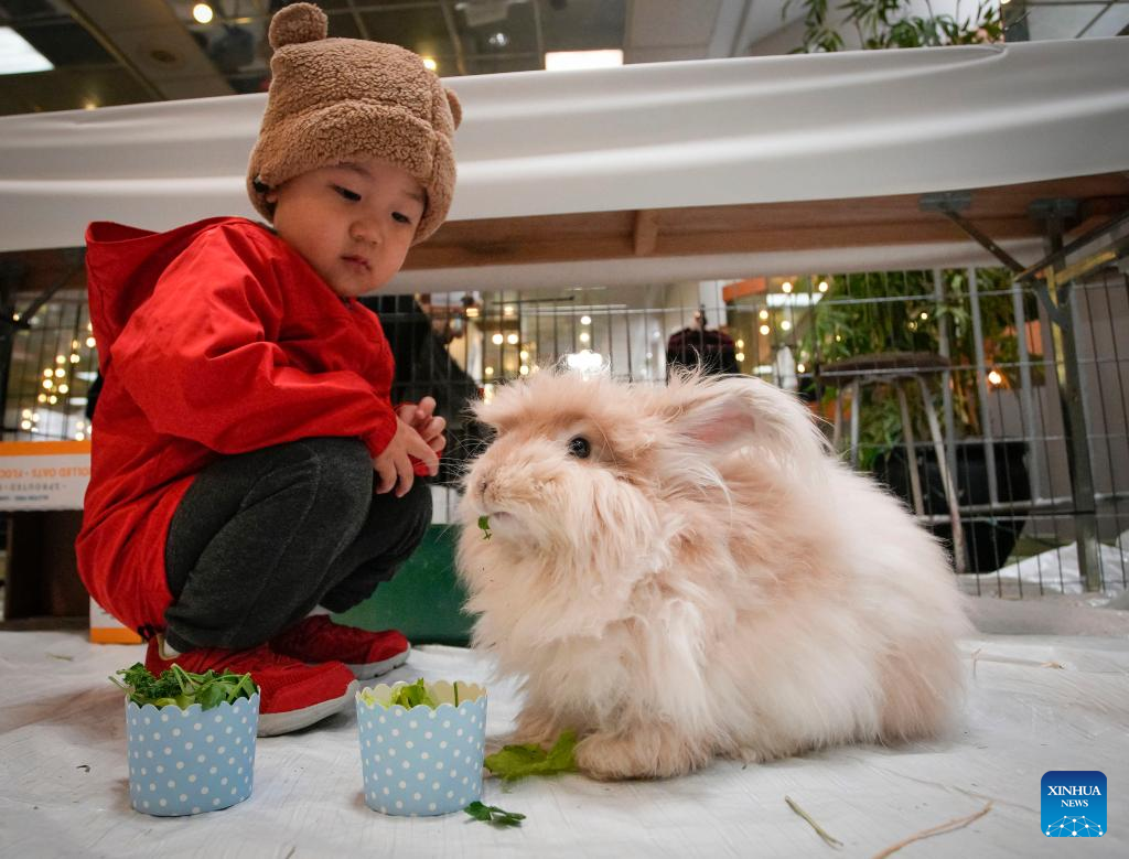 A child looks on as a bunny feeds during the Pet Lover Show at Pacific Coliseum in Vancouver, British Columbia, Canada, on Nov. 6, 2022. (Photo by Liang Sen/Xinhua)