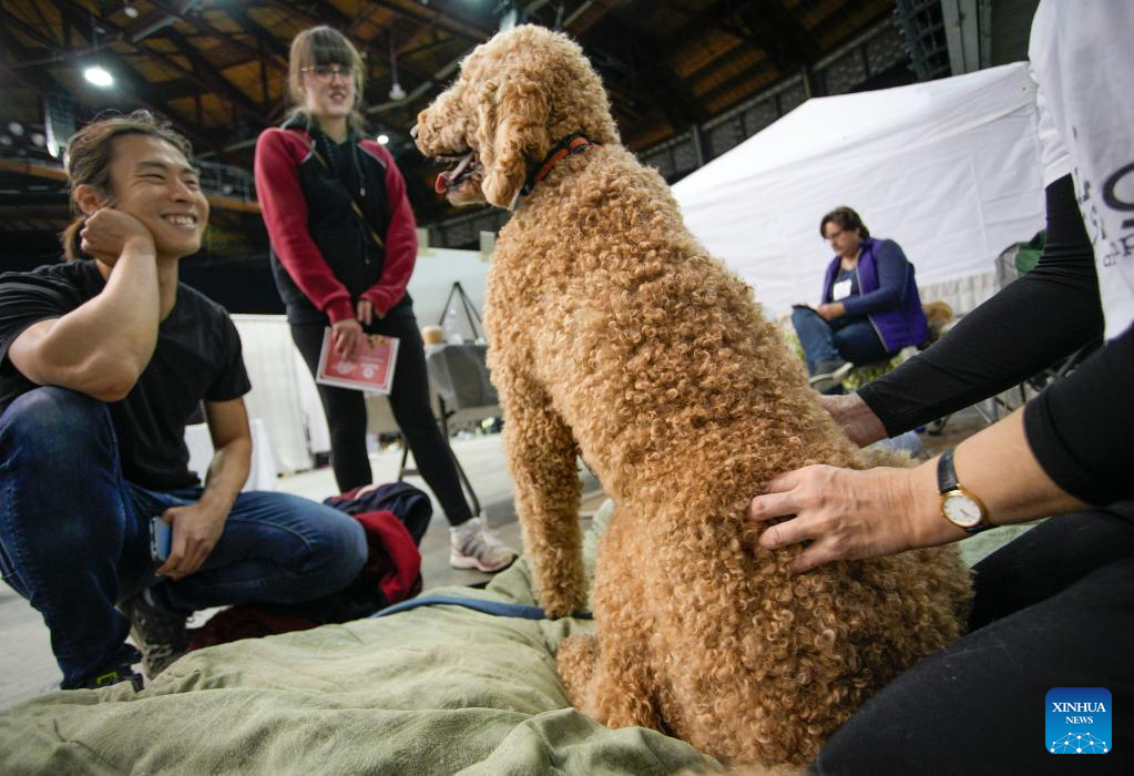 A dog receives a massage therapy during the Pet Lover Show at Pacific Coliseum in Vancouver, British Columbia, Canada, on Nov. 6, 2022. (Photo by Liang Sen/Xinhua)