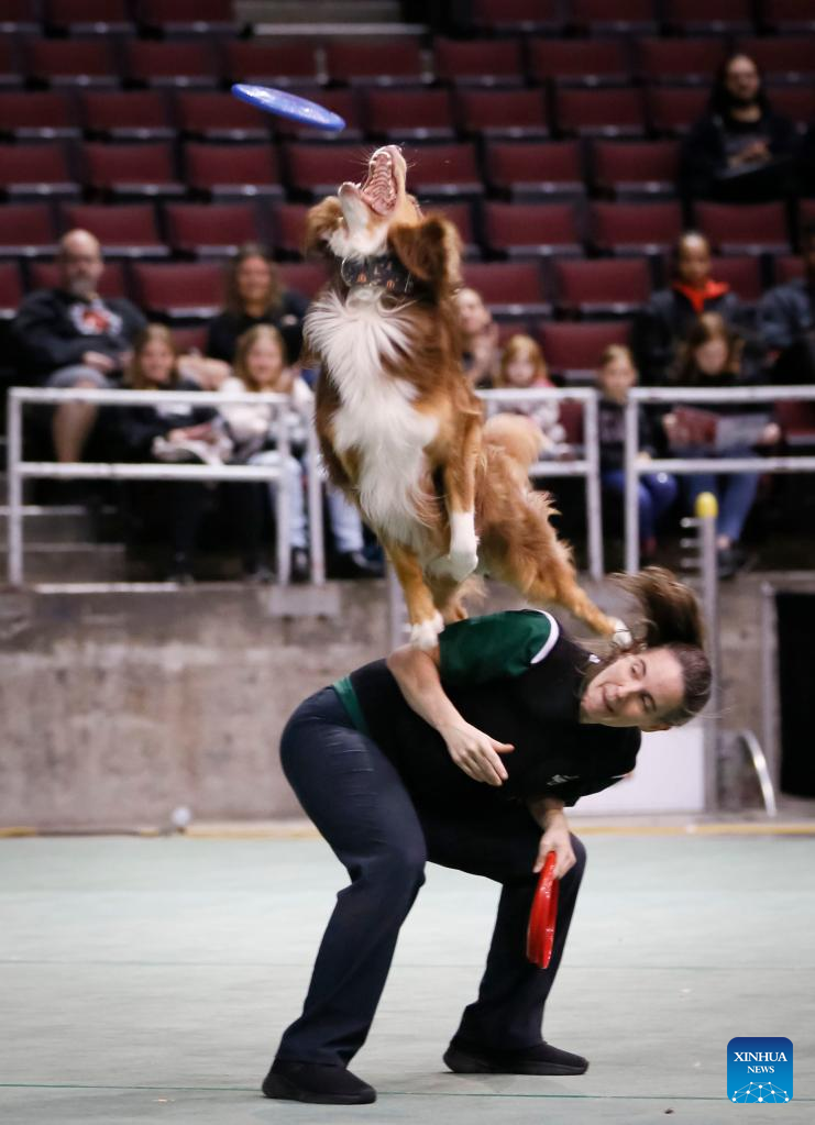 A dog tries to catch a frisbee during the Pet Lover Show at Pacific Coliseum in Vancouver, British Columbia, Canada, on Nov. 6, 2022. (Photo by Liang Sen/Xinhua)
