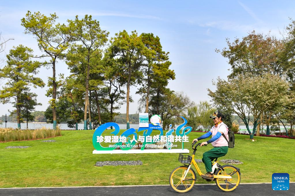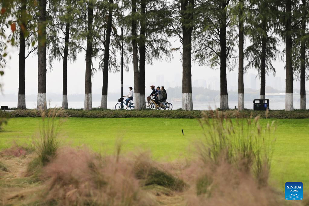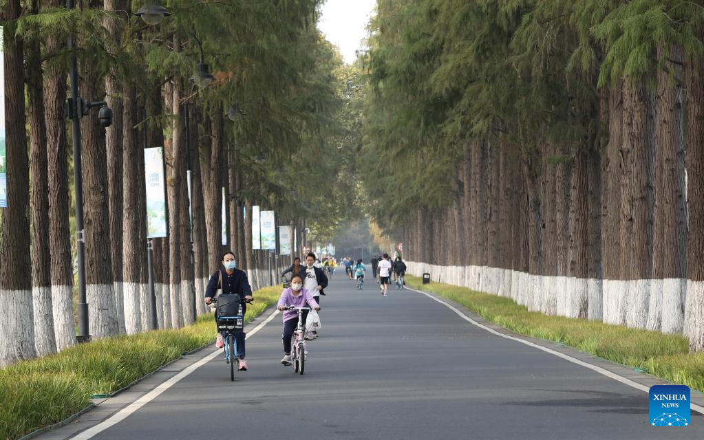 Citizens ride bicycles at Donghu Lake scenic area in Wuhan, central China's Hubei Province, Nov. 5, 2022. The 14th Meeting of the Conference of the Contracting Parties to the Ramsar Convention on Wetlands (COP14) kicked off Saturday in China's Wuhan and Switzerland's Geneva.