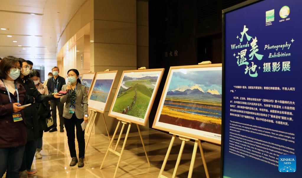 Journalists visit the Wetlands Photography Exhibition in Wuhan, central China's Hubei Province, Nov. 5, 2022. The 14th Meeting of the Conference of the Contracting Parties to the Ramsar Convention on Wetlands (COP14) kicked off Saturday in China's Wuhan and Switzerland's Geneva.