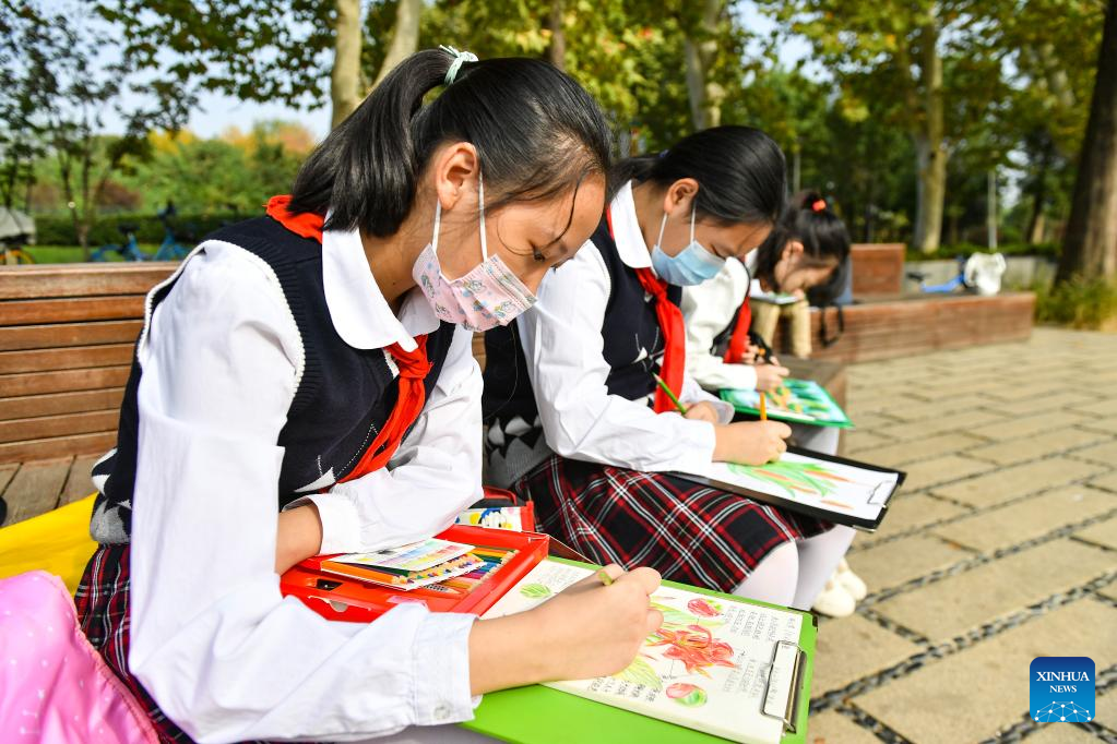 Students paint at a wetland park in Wuhan, central China's Hubei Province, Nov. 5, 2022. The 14th Meeting of the Conference of the Contracting Parties to the Ramsar Convention on Wetlands (COP14) kicked off Saturday in China's Wuhan and Switzerland's Geneva.