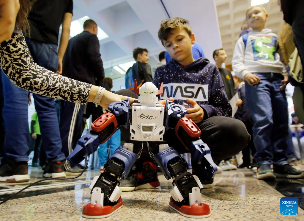 A child plays with a wireless controlled robot during the first edition of Robofest technology festival in Bucharest, capital of Romania, Nov. 5, 2022. (Photo by Cristian Cristel/Xinhua)