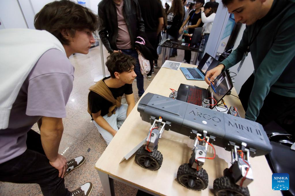 Students from Poland exhibit their robotic vehicle during the first edition of Robofest technology festival in Bucharest, capital of Romania, Nov. 5, 2022. (Photo by Cristian Cristel/Xinhua)