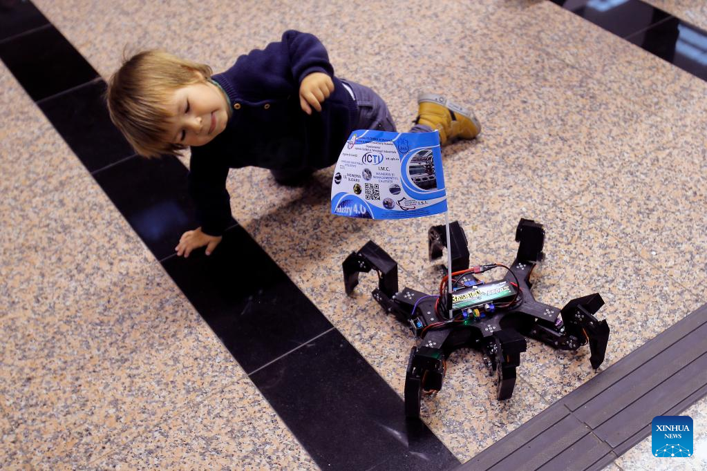 A child plays with a wireless controlled spider robot presented by students during the first edition of Robofest technology festival in Bucharest, capital of Romania, Nov. 5, 2022. (Photo by Cristian Cristel/Xinhua)