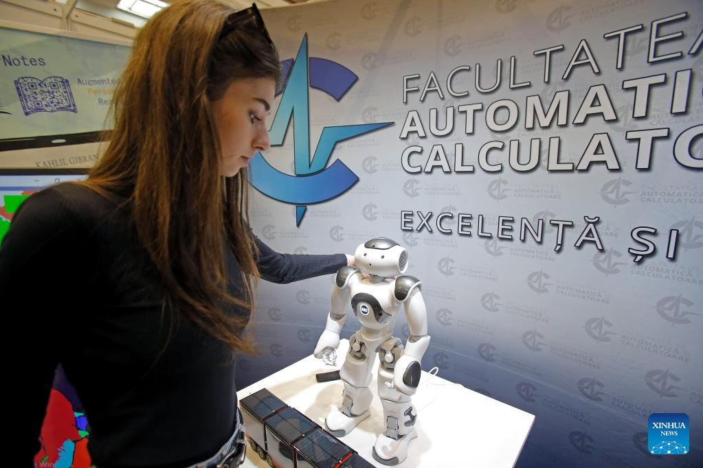 A participant presents Nao, a humanoid, social and programmable robot, during the first edition of Robofest technology festival in Bucharest, capital of Romania, Nov. 5, 2022. (Photo by Cristian Cristel/Xinhua)