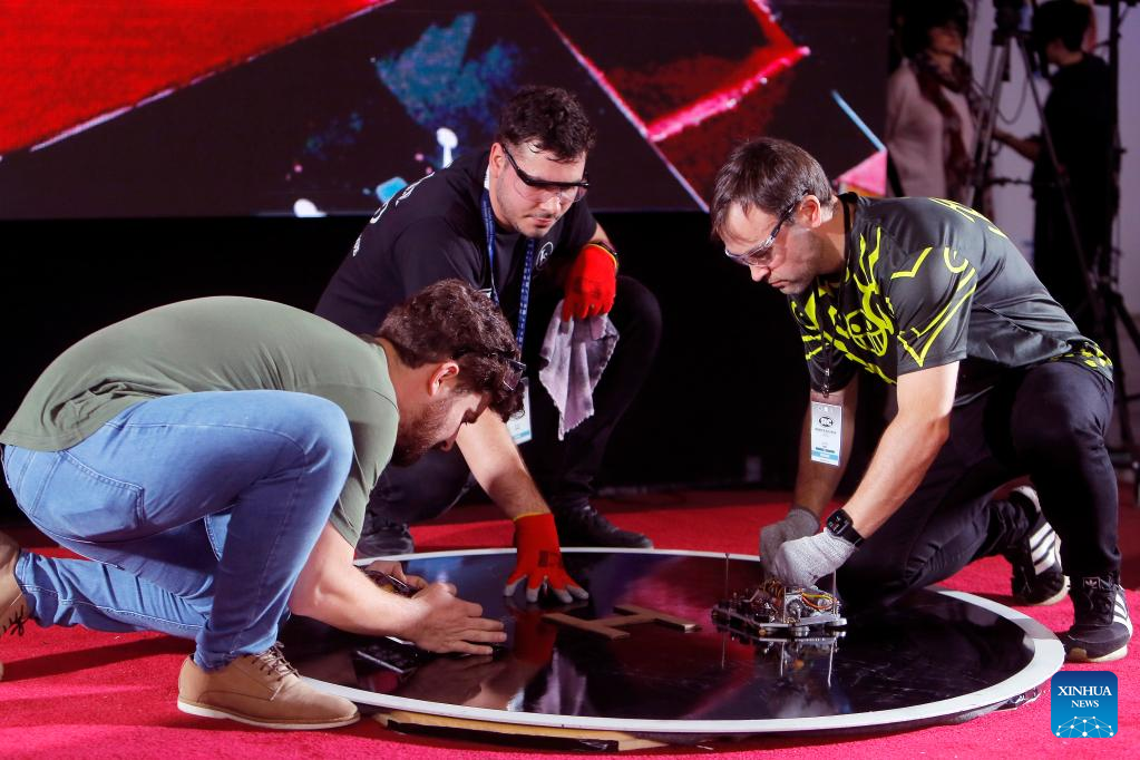 Participants prepare their robots for a Sumo competition during the Robochallenge, part of the first edition of Robofest technology festival in Bucharest, capital of Romania, Nov. 5, 2022. (Photo by Cristian Cristel/Xinhua)