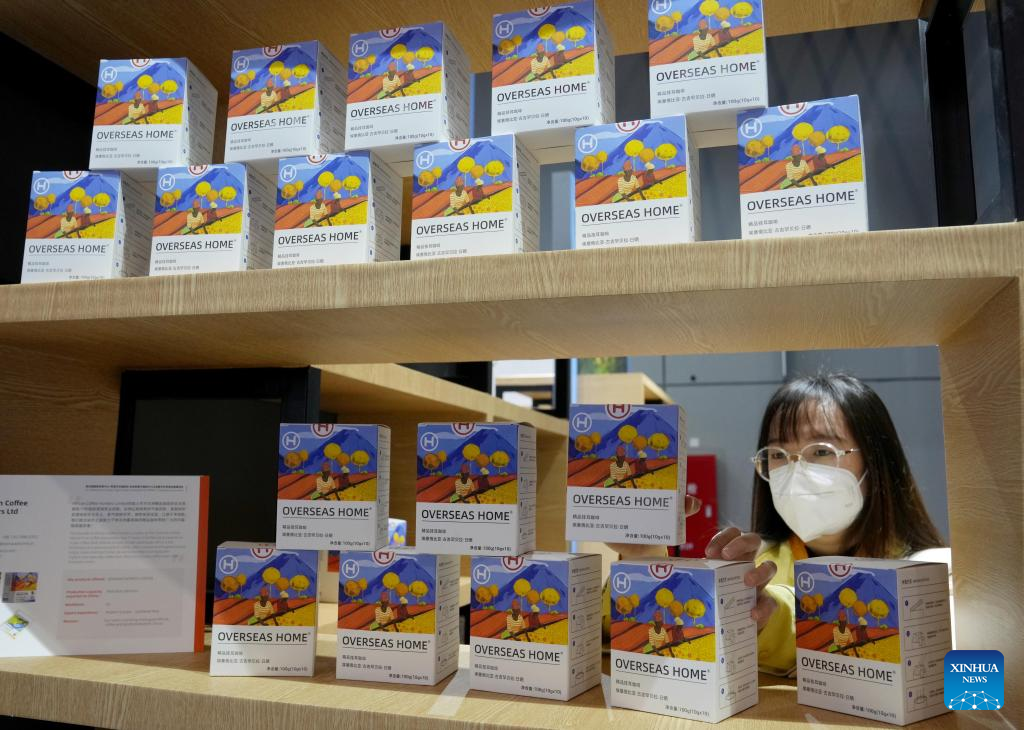 This photo taken on Nov. 7, 2022 shows coffee products from Ethiopia displayed at the food and agricultural products exhibition area of the fifth China International Import Expo (CIIE) in east China's Shanghai. (Xinhua/Liu Ying)