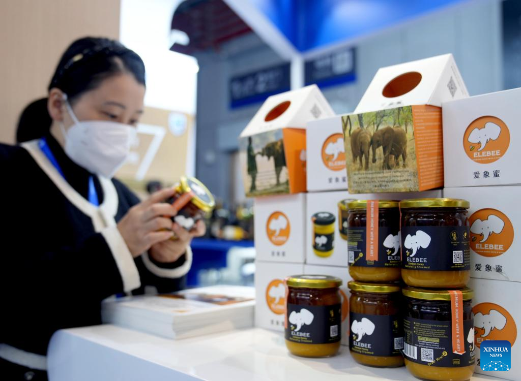 This photo taken on Nov. 7, 2022 shows honey from Zambia displayed at the food and agricultural products exhibition area of the fifth China International Import Expo (CIIE) in east China's Shanghai. (Xinhua/Liu Ying)