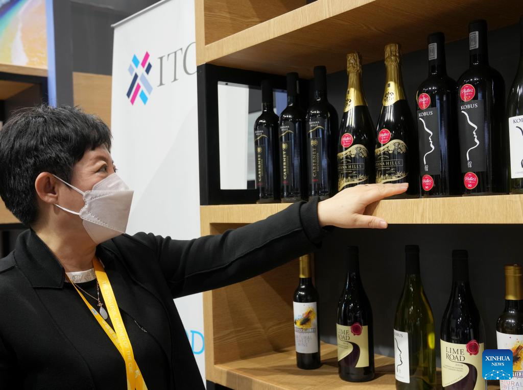 This photo taken on Nov. 7, 2022 shows red wine from South Africa displayed at the food and agricultural products exhibition area of the fifth China International Import Expo (CIIE) in east China's Shanghai. (Xinhua/Liu Ying)
