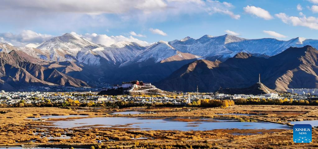 This aerial photo taken on Nov. 5, 2022 shows the Lhalu wetland in Lhasa, southwest China's Tibet Autonomous Region. (Xinhua/Zhou Dixiao)