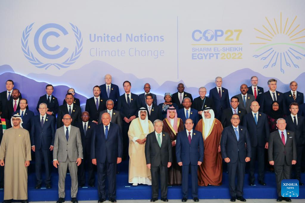 Representatives pose for a group photo before the opening of the Sharm El-Sheikh Climate Implementation Summit (SCIS) during the 27th session of the Conference of the Parties (COP27) in Sharm El-Sheikh, Egypt, on Nov. 7, 2022. (Xinhua/Sui Xiankai)