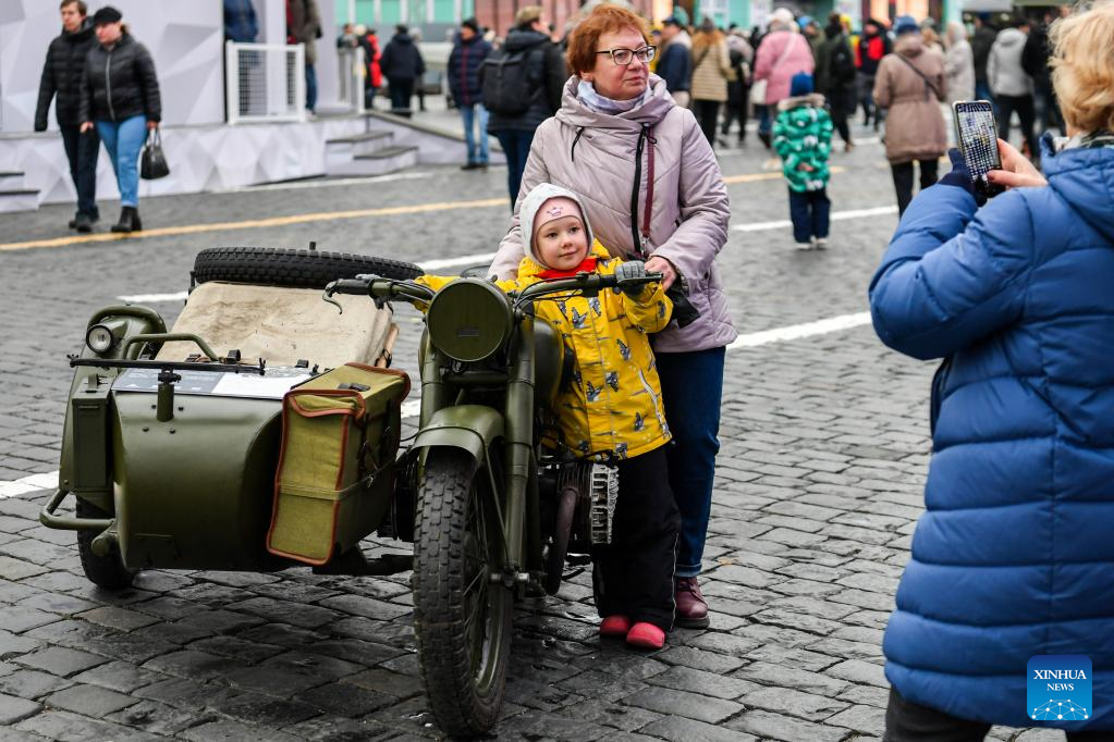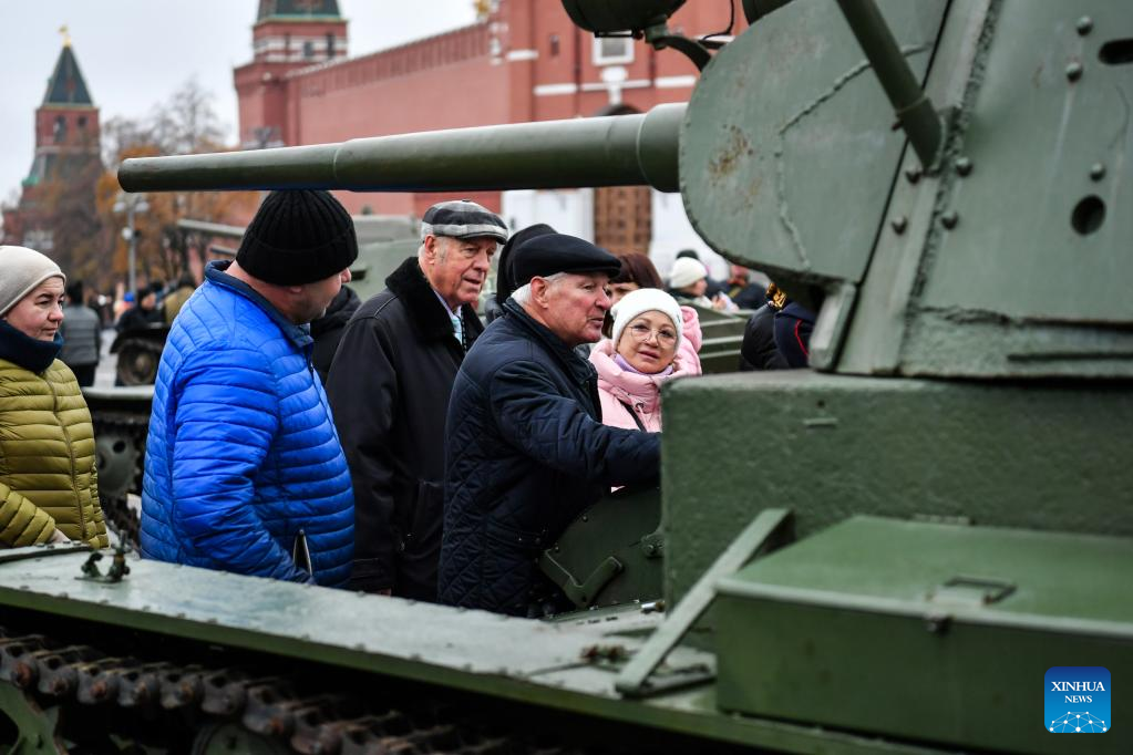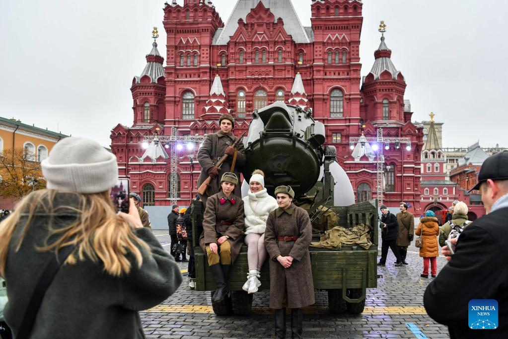 People visit an outdoor exhibition commemorating the military parade in 1941 at Red Square in Moscow, Russia, Nov. 7, 2022. (Xinhua/Cao Yang)