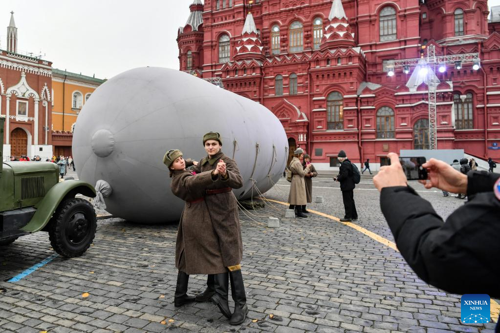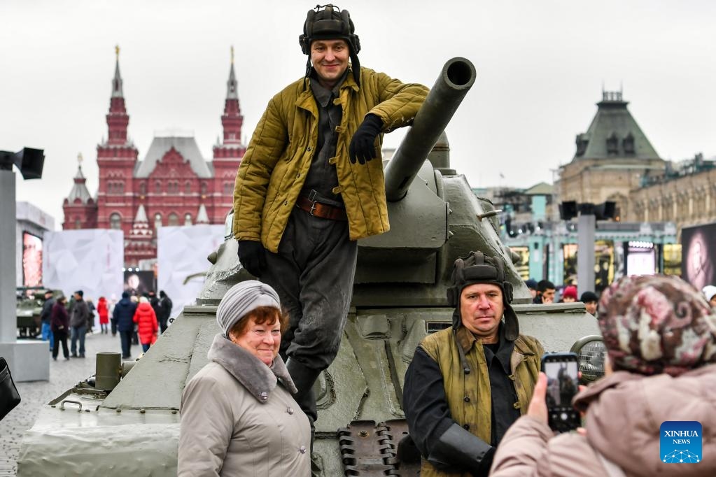 People pose for photos at an outdoor exhibition commemorating the military parade in 1941 at Red Square in Moscow, Russia, Nov. 7, 2022. (Xinhua/Cao Yang)
