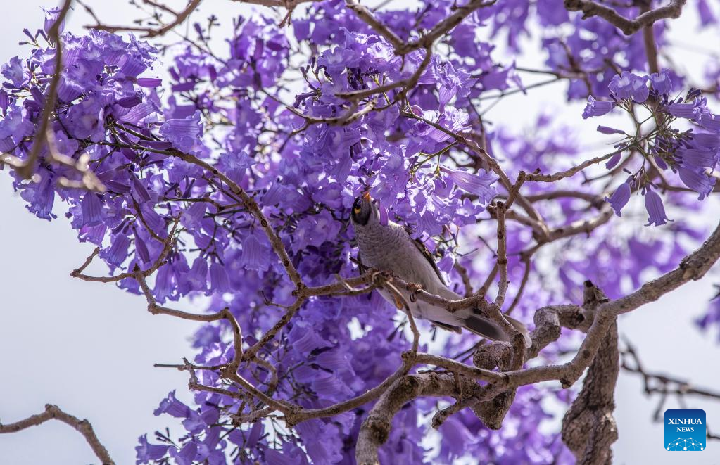 This photo taken on Nov. 8, 2022 shows a noisy miner among jacaranda blooms in Sydney, Australia. (Xinhua/Bai Xuefei)
